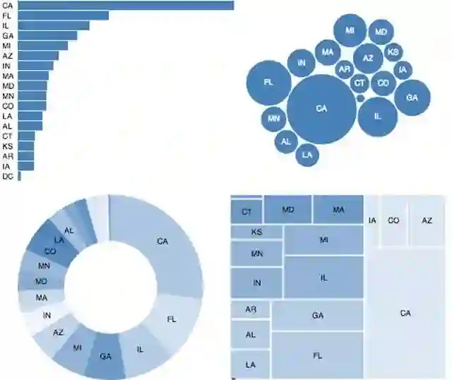 理解其他形式的图的表现优势, 比如, 气泡图支持更多地数据范围, 饼图支持局部全局的对比, 树状图能够支持分层结构等等。