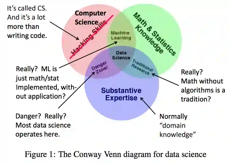 这个问题如此重要,以至于不同社区纷纷发表维恩图来证明他们自己在数据科学中的中心地位。最近有一篇文章[10]对这些图表进行了总结和评论。其他维恩图表示相关的所有观点,请查询维基百科数据科学维恩图。