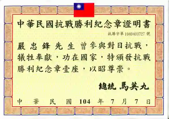 9月3日,是中国人民抗日战争胜利72周年纪念日,两年前国共两党殊途同归,在纪念这一中国历史上的重大事件中珠联璧合,发放抗战胜利70周年纪念章就是其中一个细节。这是海峡两岸中国人在追寻民族之魂路上高度默契达成的共识,是传承中华民族凝聚力与民族向心力的真实展示,我有幸经历并见证了这一历史时刻。回顾为家父严忠铎申请抗战胜利70周年纪念章的过程,心中涌起五味杂陈的感叹。