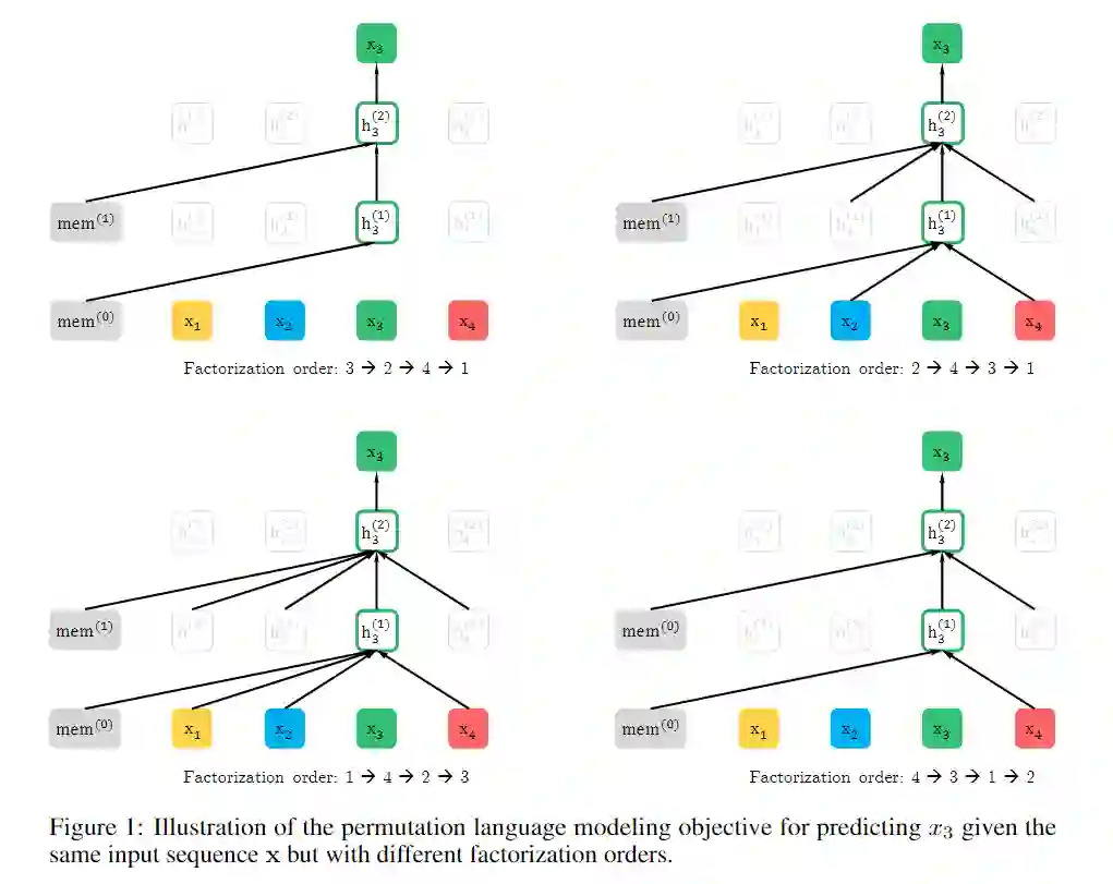 为了说明总体情况,给出如下图示。展示了在给定相同输入的文本序列但对应不同的因子分解顺序下,预测token。左边的mem表示transformer-XL中的memory单元。