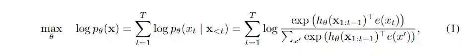 作者们认为,当前预训练最主要的两个目标可分为两类,一类是类似GPT的AR(AutoRegression,自回归) 方式。即根据前面所有信息预测后一个token,不断重复(自回归)。形式化的描述为: