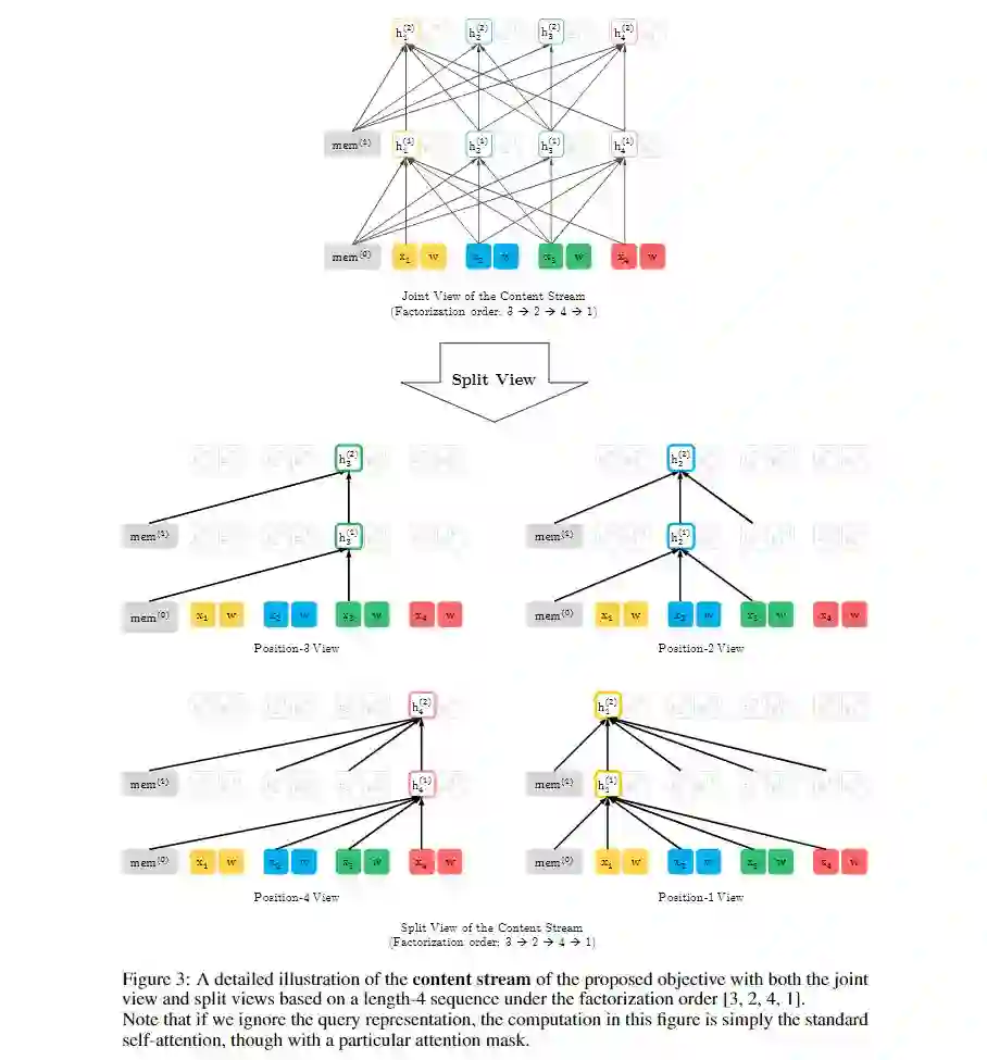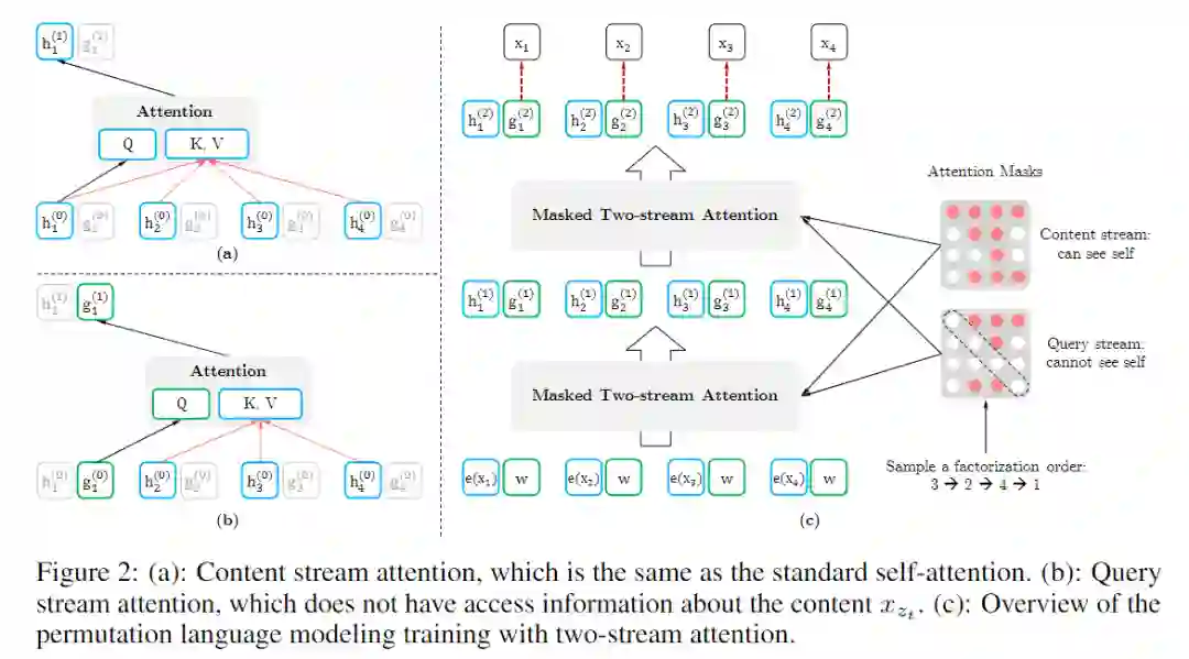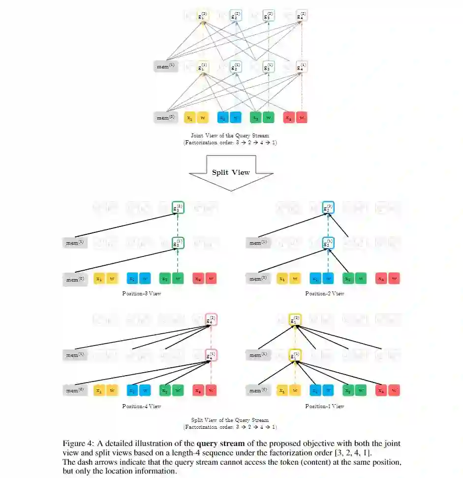 query stream的表示与上述类似。图2及图3、图4展示了基于双流自注意机制的PLM的概述。