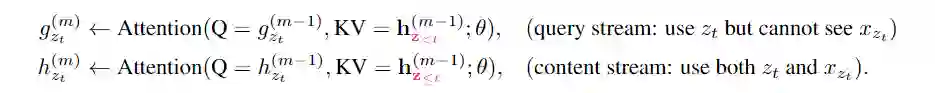 其中与传统transformer中的query,key,value相对应。content表示的更新规则与标准的self-attention完全相同,在微调阶段,可简单地删除query stream,将content stream作为transformer(-XL)的输出。最后,我们使用最后一层的query表示来计算式。