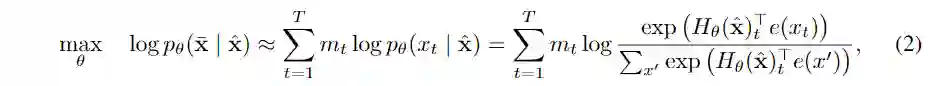 其中表示经过mask后的文本序列,即带噪输入。表示给定的文本序列中所有被mask的token的集合,表明token 被mask,表示将一个长为的文本序列映射成一个隐向量序列