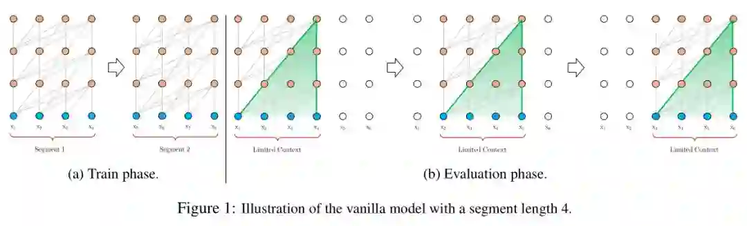 Transformer编码固定长度的上下文。具体地,将一个长文本序列截断为几个固定长度的片段(segment),然后分别编码每个片段,片段间没有任何的信息交互(如BERT的预训练模型中序列长度的极限为512)。如下图所示