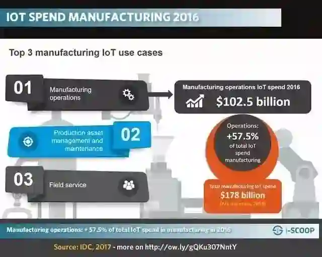 根据2017年初IDC发布的研究,从支出的角度看,在制造业中除了运营之外,还有两个其他最重要的应用场景是生产资产管理和维护以及现场服务。