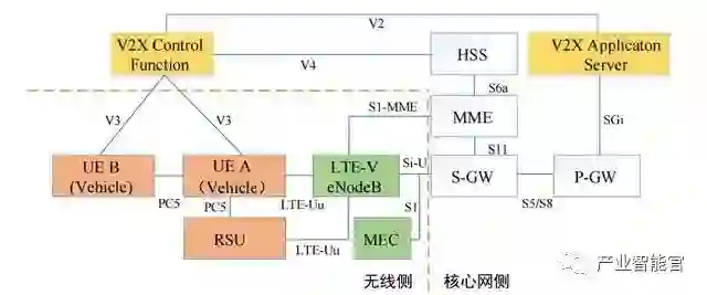 基于LTE-V2X的车联网网络架构如图3-10所示,是在蜂窝网架构基础上进行的增强和改进,其中涉及的关键网元及其功能如下: