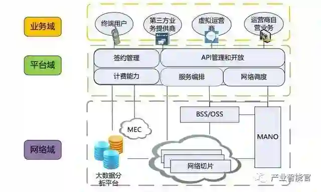网络域包含了运营商的BSS/OSS、MANO、网络切片和网元实体、MEC、大数据分析平台等网络要素实体。其中,BSS/OSS和MANO能力的结合实现对网络切片的统一编排管理,以及对平台域的能力开放。网络切片可支撑不同车联网业务需求,在不同应用场景下实现不同的网络配置。网元实体实现具体的网络控制能力、监控能力、网络信息以及网络基本服务能力的开放。大数据分析平台实现对网络基础数据的大数据分析,并将分析结果上报给平台域进行对外开放。