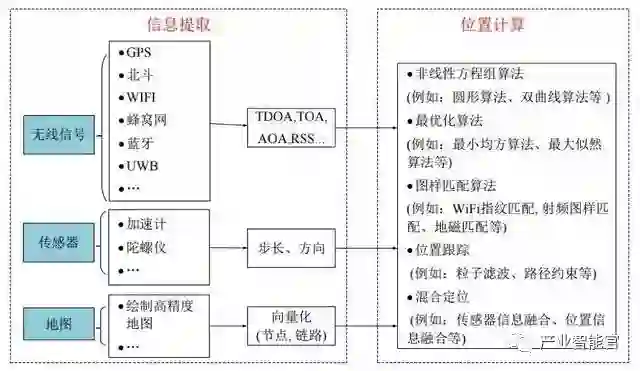 信息提取:可用于定位的对象包括无线信号(例如GPS、北斗、WiFi、蜂窝网等)、传感器(例如加速器、陀螺仪等)以及地图信息等,而不同的对象提取出的定位信息参数也各不相同。对于无线信号,收发机之间距离信息需要通过估计两者无线信道链路的参数信息来获取,该参数包括接收信号强度(Received Signal Strength,RSS)、到达时间(Time of Arrival,TOA)、到达时间差(Time Difference of Arrival,TDOA)、到达角(Angle of Arrival,AOA)等。实际接收的无线信号受非视距传输及多径效应、阴影效应的影响,因而即使精确估计信道参数信息,也难以获取准确的收发机之间的直线距离。传感器获得的是定位目标的运动方向、步长等信息。地图信息通常通过绘制高精地图,获得向量化参数,用来对定位目标进行约束或优化。上述参数是进行下一步位置估计的前提。