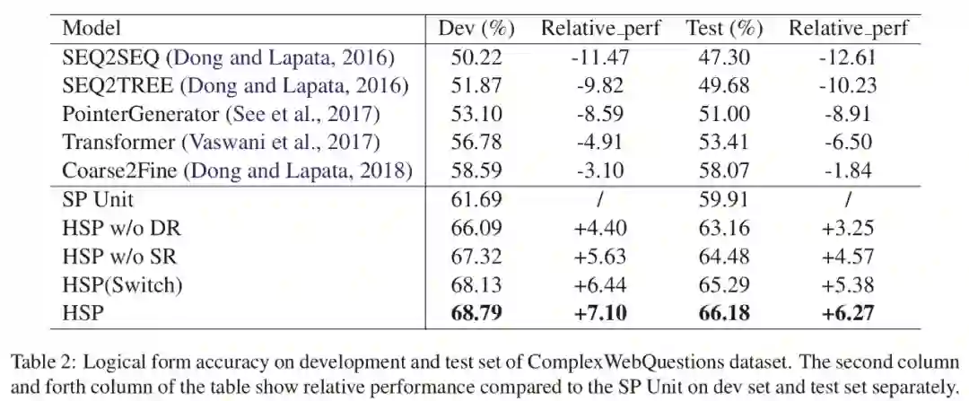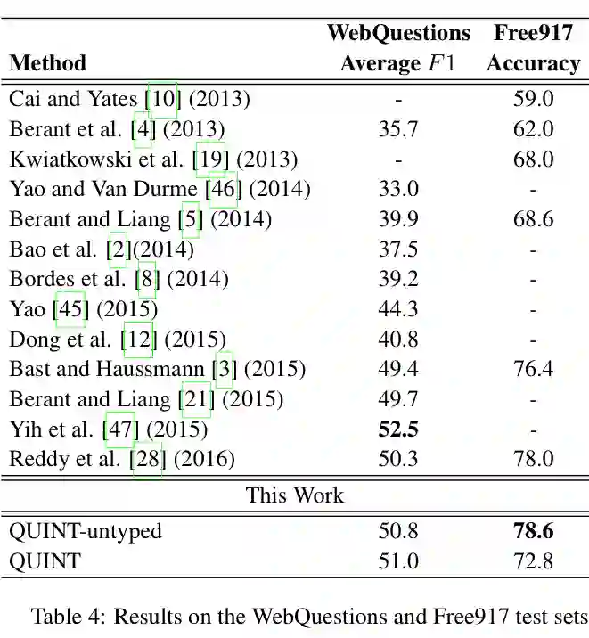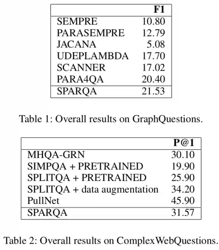 作者在 WebQuestions、Free917、ComplexQuestions 三个数据集上进行实验。在 WebQuesitions 上直接使用 F1 作为评价指标,没有达到 SOTA 效果。Free917 上的评价指标是正确回答的准确率,进行标准答案集进行评价。