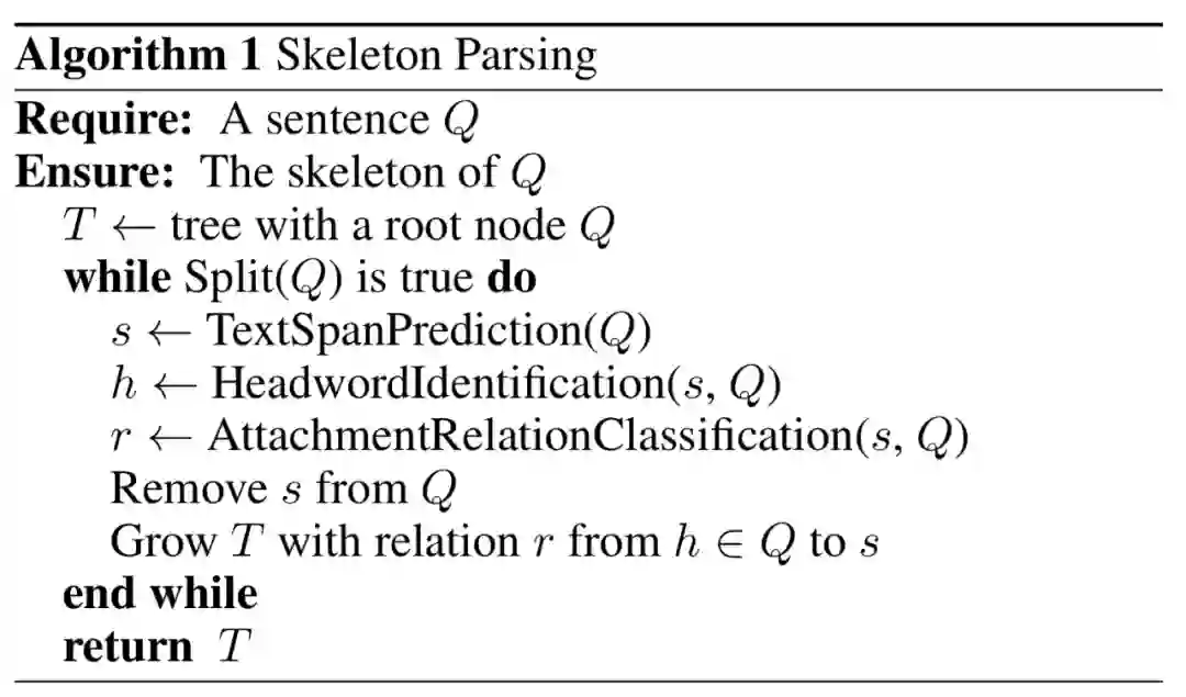 骨架具有树结构。当确定骨架语法的粒度并定义文本片段和附属关系的类型时,我们要提供的这种树结构的关键特征是:通过迭代地删除其叶节点,每次迭代中剩余的文本片段始终包含一个格式最完善的句子,直到达到一个简单句子为止,这样就不可能进一步拆分。这种高级结构有助于将复杂问题的主干与其他部分区别开来。