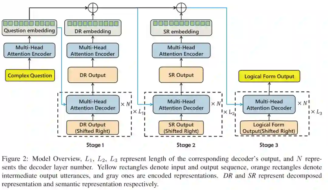 在该工作中,作者提出一种新颖的分层语义解析(Hierarchical Semantic Parsing, HSP)方法,该方法利用复杂问题的可分解性进行语义解析。该模型是基于分解-集成的思想,以三阶段的解析架构设计。
