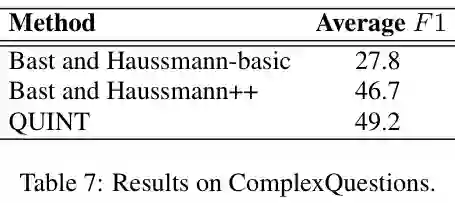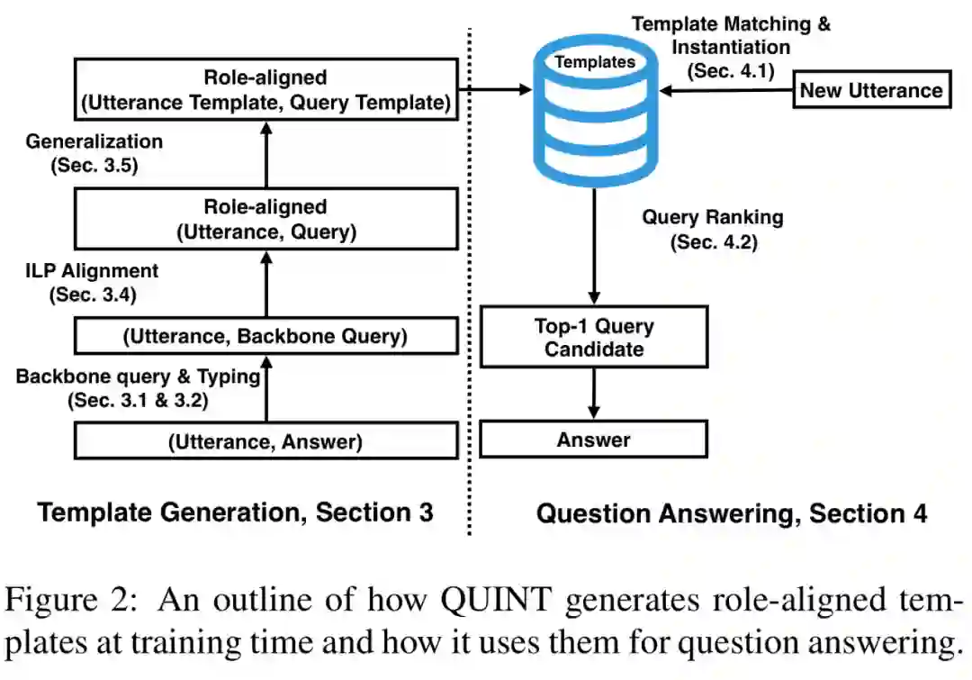 具体而言,模板是如何构建的?简言之,QUINT 首先用 NER 方法识别和消岐语句中的实体,QUINT 从在 KG 中找到的包含答案和所识别实体的最小子图生成查询,保留 F1 最高的查询。