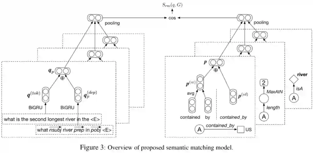 问题的局部信息编码,是利用依赖解析表示答案和焦点结点之间长距离的依赖。问题中是没有直接的答案的,答案是用问题中的 wh-单词表示的,作者提取了从答案节点到问题中焦点结点的依赖路径。作者使用了另一个双向 GRU 层来产生依赖层次的向量表示,同时捕捉语法特征和局部的语义特征。
