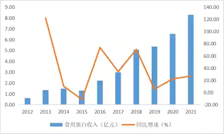 以植物肉为首的下游旺盛的市场需求直接带动豌豆蛋白生产企业业务快速增长。以双塔食品为例,2012-2021年,双塔食品豌豆蛋白业务的收入规模由0.60亿元扩大至8.29亿元,CAGR达33.5%。