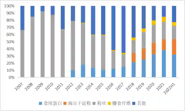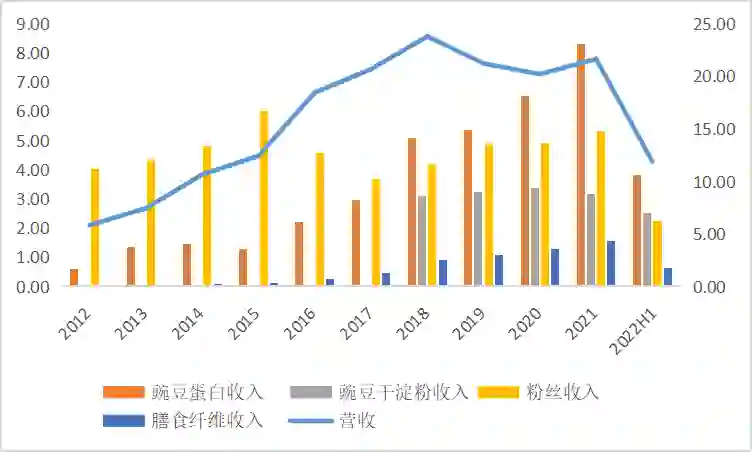 2012年起双塔逐步向豌豆全产业链延伸,在原有业务基础上增加豌豆加工业务,产品主要包括豌豆蛋白、淀粉、膳食纤维等。自2018年起,豌豆蛋白已超越粉丝业务,成为双塔食品的第一大收入来源,也是其实现收入增长的主要推动力。
