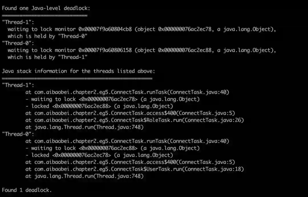 可以看到,在 jstack 日志的底部,其直接帮我们分析了日志中存在哪些死锁,以及每个死锁的线程堆栈信息。