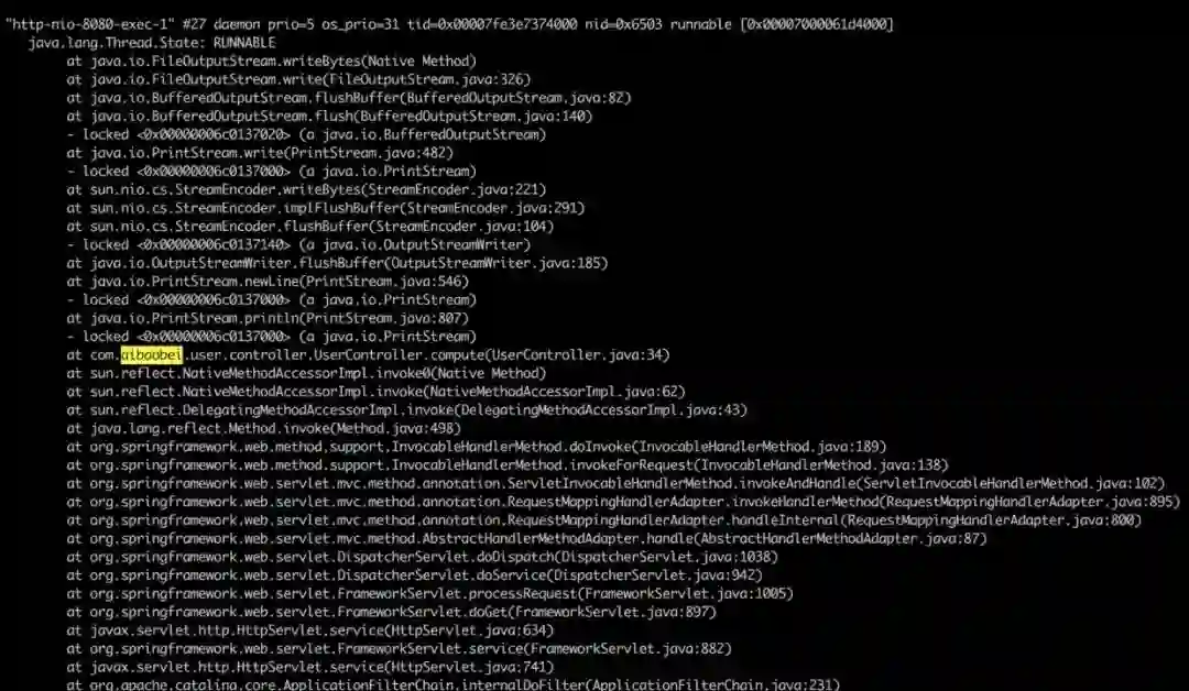 我们可以根据堆栈信息,直接定位到 UserController 的 34 行,查看代码中具体是什么原因导致计算量如此之高。