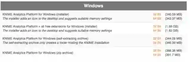 在开始KNIME之前,首先你需要安装它并在PC上设置它。到KNIME下载页面(http://www.knime.com/downloads)下载。