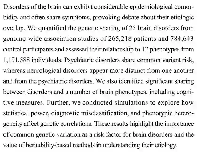 (导读 郭怿暄)脑部疾病常表现出共患病并具有相同症状,这使其在病因学上是否重叠存在争议。本研究对25种脑部疾病患者的遗传共性进行定量分析并寻找其与表型的关系,发现精神性疾病之间有共同遗传变异,但神经性疾病彼此间以及与精神性疾病间均存在明显差异。提示脑部疾病存在共同的遗传变异作为危险因素,该研究为基于遗传力理解病因学的方法奠定基础。