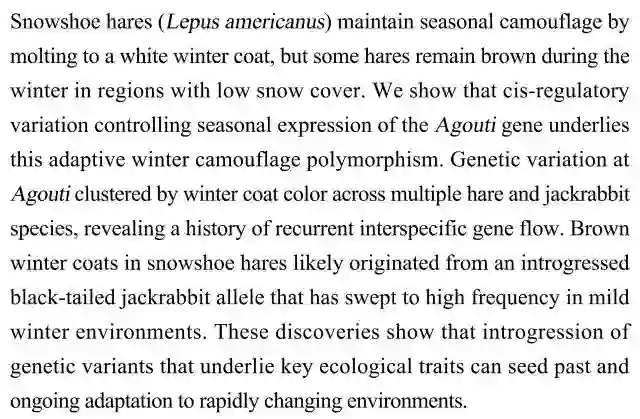 (导读 王思菲)雪鞋兔(Lepus americanus)多为白毛冬毛做伪装,但一些少积雪区的个体冬毛为褐色。我们发现控制季节性表达Agouti基因的顺式调控变异是这种适应性冬季伪装多态性的基础,褐色冬毛可能源于黑尾长耳野兔等位基因的滲入,并在少积雪环境中迅速扩散。结果表明,关键生态性状的遗传变异渗入让物种具有适应环境迅速变化的可能。