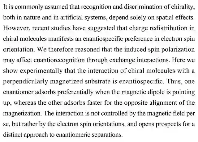 (导读:向菲菲)识别和区分天然或人造手性物质通常被认为只依赖于空间效应。本研究在实验上发现手性分子与垂直磁化衬底的相互作用会产生对映关系,及一对映体在磁偶极子向上时优先吸附,而另一对映体则在磁化方向相反时吸附更快。这种作用不是由磁场本身控制,而是由电子自旋的方向。研究结果开辟出一种独特的分离对映异构体的途径。