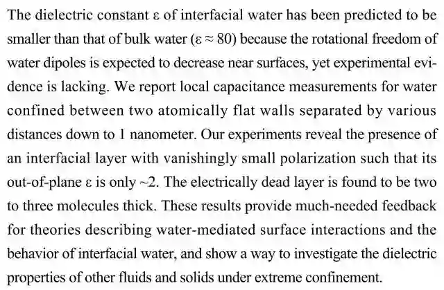 (导读:向菲菲)界面水由于其偶极子的旋转自由度在界面降低,造成其介电常数小于正常非空间受限的水,但这一理论预测一直缺乏实验证据。本研究通过测量被两个具有原子级厚度的腔壁限制的水的局部电容,发现了具有微小极化的界面层的存在,其介电常数只有~2。该结果为研究其他固、液体在极端空间限域条件下的介电性质提供了一种可行方法。