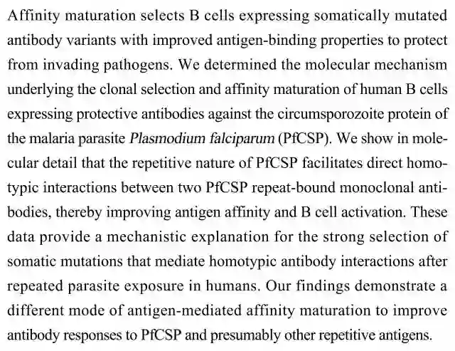 (导读 王思菲)为了抵抗病原体入侵,亲和力成熟会选择表达抗原结合能力更强的变异抗体的B细胞。本研究确立了表达恶性疟原虫环子孢子蛋白(PfCSP)保护性抗体的人类B细胞克隆选择和亲和力成熟的分子机制。发现PfCSP的重复序列加强了与之结合的两个单克隆抗体直接同型相互作用,进而增强抗原亲和力和B细胞活化。该研究发现了介导的亲和力成熟的全新模式。