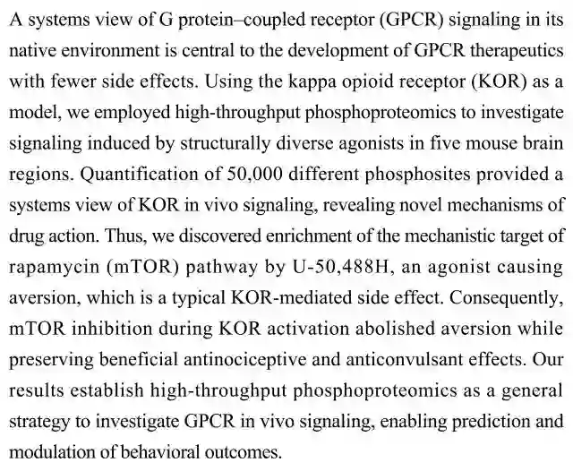 (导读:过泽远)对G-蛋白联结受体(GPCR)信号在自然环境中的系统性观察对开发副作用更小的GPCR治疗方法很重要。本研究以κ阿片受体(KOR)为模型,在结构多样的激动剂诱导后对小鼠大脑五个区域的磷酸化蛋白质组进行高通量分析,对50000个磷酸位点进行定量,揭示药物作用的全新机制。发现并纠正了U-50,488H治疗中mTOR激活引起的副作用,这一发现为在体研究GPCR信号带来普适方法。