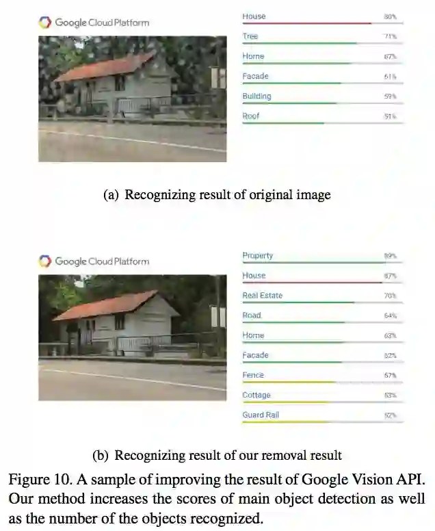 为了进一步证明我们的可见性增强方法对于计算机视觉应用是有用的,我们使用了谷歌视觉API (https://cloud.google.com/vision/)来测试使用我们的输出是否可以提高识别性能。结果如图10所示。