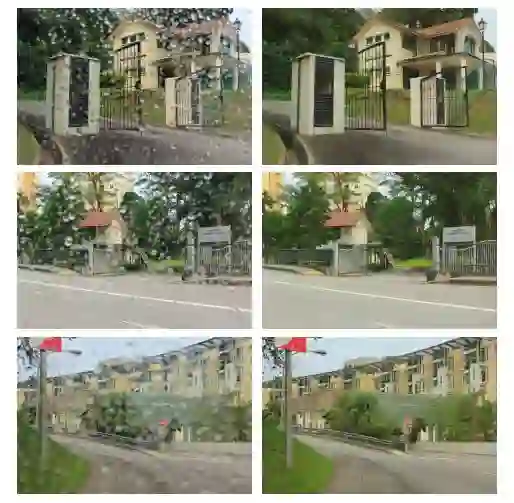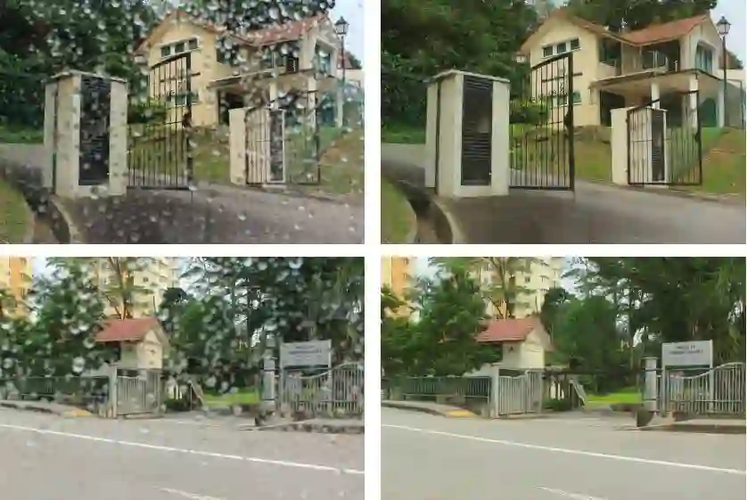 图1:雨滴去除方法的演示。左图:输入的有雨滴的图像。右图:我们的结果,大多数雨滴被去除了,结构细节也被恢复。放大图片可以更好地观察修复质量。