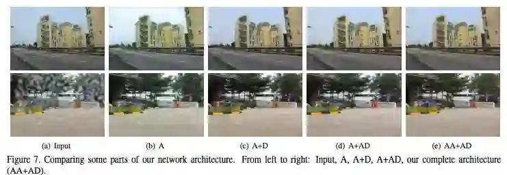 Contextual Autoencoder:背景自动编码器的目的是产生一个没有雨滴的图像。自动编码器的输入是输入图像和Attentive-Recurrent网络的最终注意力图的连接。我们的deep autoencoder有16个conv-relu块,并且跳过连接以防止模糊输出。