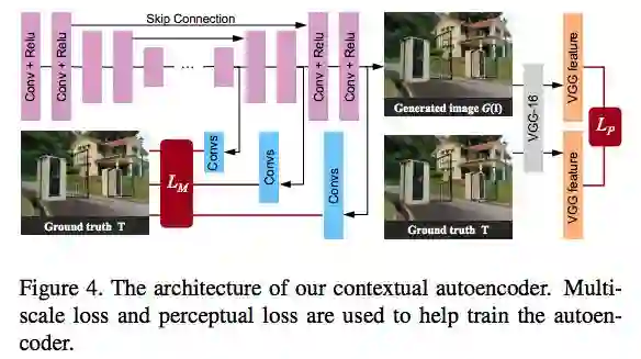 生成网络的第二部分是一个自动编码器(autoencoder),它以输入图像和注意力图作为输入。为了获得更广泛的上下文信息,在自动编码器的解码器侧,我们应用了多尺度损失(multi-scale losses)。每个损失都比较了卷积层的输出和相应的ground truth之间的差异。卷积层的输入是解码器层的特征。除了这些损失之外,对于自动编码器的最终输出,我们应用一个感知损失来获得与ground truth更全面的相似性。最后的输出也是生成网络的输出。