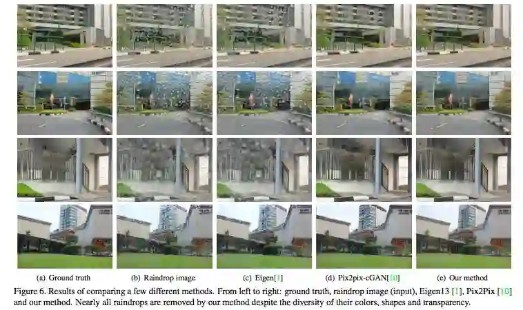 有几种方法可以解决雨滴的检测和去除问题。但是,一些方法专用于检测雨滴而不能将其去除,一些方法不适用于普通相机拍摄的单个输入图像,或者只能处理小的雨滴,并且产生的输出很模糊。