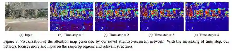 为了解决这个问题,我们使用生成对抗网络(GAN)。在这个网络中,产生的输出将由判别网络(discriminative network)进行评估,以确保输出看起来像真实的图像。为了解决问题的复杂性,生成网络( generative network)首先尝试生成一个注意力图(attention map)。注意力图是这个网络中最重要的部分,因为它将引导生成网络关注雨滴区域。 注意力图由一个循环网络生成,该循环网络由深层残差网络(ResNets)和一个卷积LSTM和几个标准的卷积层组成。我们称之为attentive-recurrent network。
