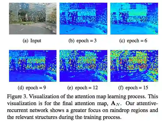 我们提出了一种基于单幅图像的雨滴去除方法。该方法利用生成对抗网络,其中生成网络通过attentive-recurrent网络产生注意力图(attention map),并将该图与输入图像一起通过contextual autoencoder生成无雨滴图像。然后,判别网络评估生成的输出的全局和局部有效性。为了能够局部验证,我们将注意力图注入网络。该方法的创新之处在于在生成网络和判别网络中使用注意力图。我们还认为,我们的方法是第一种可以处理相对严重的雨滴图像的方法,而目前最先进的雨滴去除方法尚没有解决这个问题。