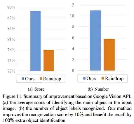 可以看出,使用我们的输出,一般的识别比没有我们的可见性增强过程要好。此外,我们对测试数据集进行评估,如图11的统计数据显示,使用我们的可见性增强输出在识别输入图像中的主要对象的平均得分和识别出的对象标签数方面,显著优于没有可见性 增强的输出。