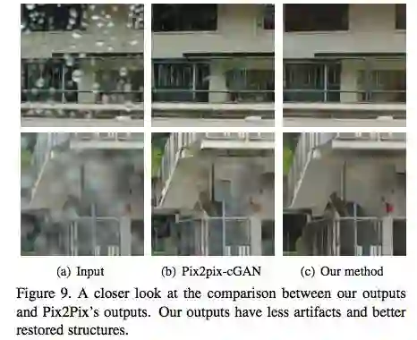 图9:我们的输出和Pix2Pix输出之间的比较。我们的输出具有更少的伪影和更好的复原结构