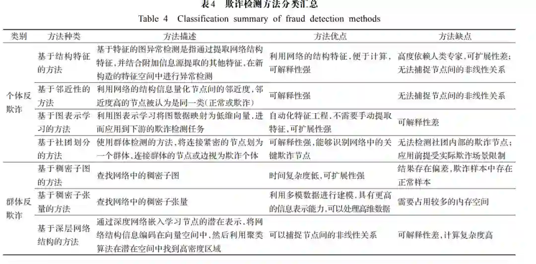 不同的复杂网络的欺诈定义和检测方法不同,应根 据复杂网络的具体应用场景以及侧重的特征选择合适 的异常检测方法。欺诈检测方法的分类汇总如表4。
