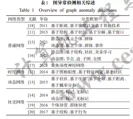 图数据结构对关联信息强大的表示能力以及图计 算和深度神经网络等相关技术的发展,使得图异常检测 技术逐渐成为国内外学者的研究热点。Akoglu 等人[11] 将图异常检测技术分为基于结构、基于社区、基于分解 和基于窗口等类型,系统梳理了每类方法下的关键技 术,并讨论了图异常检测技术在包括欺诈检测在内的真 实场景下的应用。Gupta等人[12] 对时序网络中的图异常 检测技术进行了总结和归纳,包括基于图相似度、基于 特征向量和基于社区这三类方法。Ranshous 等人[13] 全 面概述了动态图中的异常检测技术,将其划分为基于社 区、基于压缩、基于分解、基于距离和基于概率分布五 种类型,并对每类方法中的主流算法进行对比分析。 Savage等人[14] 关注于在线社交网络(online social network, OSN)中不同类型异常(如异常节点、边缘或子图)的检 测。他们将 OSN中的异常检测总结为两个步骤:(1)网 络特征的选择和计算;(2)基于该特征空间对观测进行 分类。李忠等人[15] 分别基于静态图和动态图的视角,根 据异常类型进一步将静态图异常检测划分为孤立个体 异常检测和群体异常检测两类,动态图异常检测分为孤 立个体异常检测、群体异常检测和事件异常检测三类, 并系统梳理了每类异常检测的关键性技术。苏红军等 人[16] 从技术层面将静态图异常检测分为基于结构、基于 社区和基于关系学习三类,按照异常类型将动态图异常 检测分为基于节点、基于边、基于子图和基于全图四类。 近年来,基于深度神经网络进行图异常检测成为新近研 究热点,陈波冯等人[17] 从静态图和动态图角度出发,全 面概括了基于深度神经网络的图异常检测的研究现状, 并总结了图异常检测的实际应用场景和相关数据集。