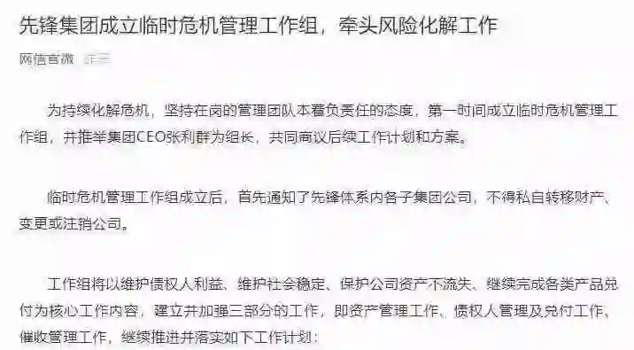 在掌门人辞世后,先锋集团在封锁消息数天后成立了临时危机工作组来处理后续的兑付以及收账问题: