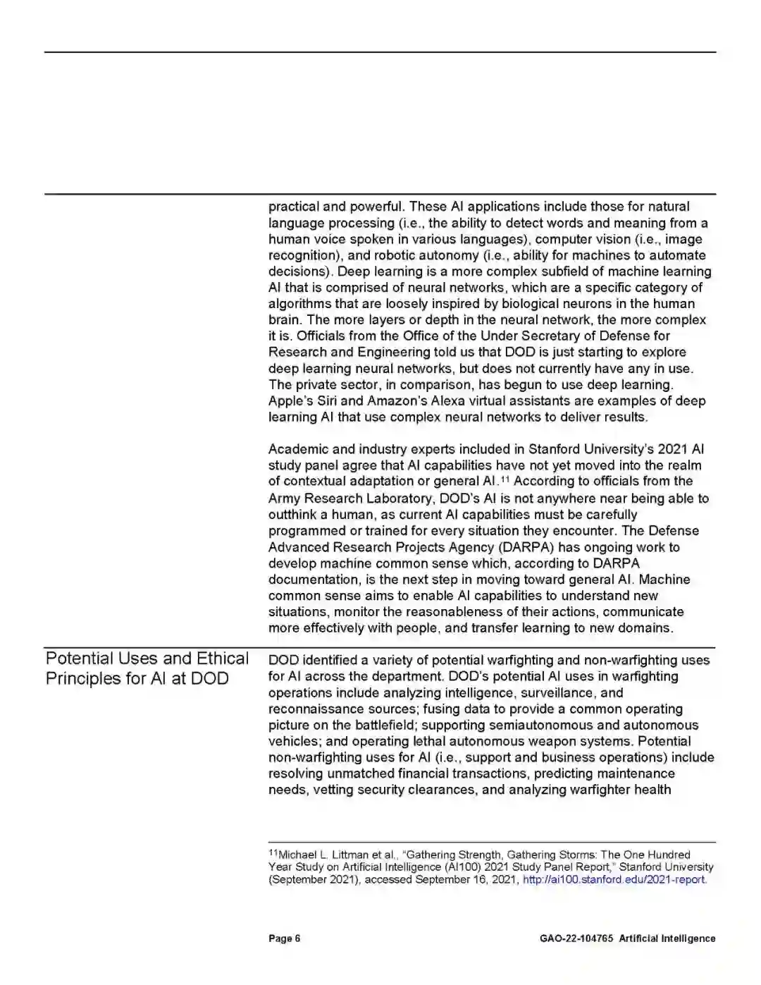 国防部认识到开发和使用人工智能不同于传统软件。传统软件的编程是根据静态指令执行任务,而人工智能的编程则是学习如何改进给定的任务。这需要大量的数据集、计算能力和持续监控,以确保功能按预期执行。支持国防部作战任务的大部分人工智能能力仍在开发中。这些能力主要集中在分析情报,增强武器系统平台,如不需要人工操作的飞机和舰船,并在战场上提供建议(如将部队转移到哪里)。