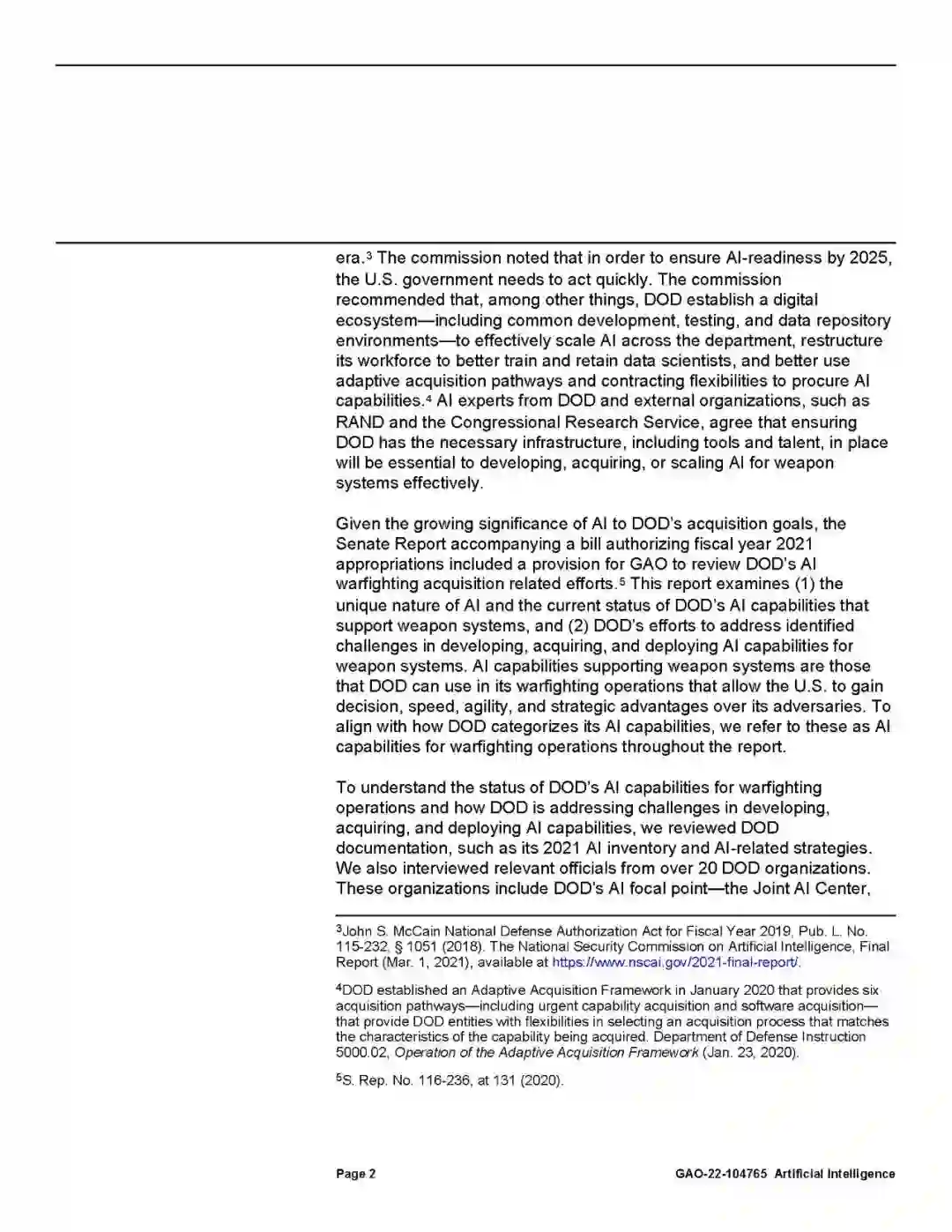 当获取依赖于复杂软件的新能力时,国防部一直面临着挑战,例如长时间的获取过程和熟练工人的短缺。GAO发现,它继续面临这些挑战,同时还面临人工智能特有的其他挑战,包括有可用的数据来训练人工智能。例如,人工智能探测对手的潜艇需要收集各种潜艇的图像,并标记它们,这样人工智能就可以学会自己识别。国防部还面临着将训练有素的人工智能集成到非为其设计的现有武器系统中的困难,以及在其人员中建立对人工智能的信任。国防部发起了一系列努力,如为人工智能和人工智能特定培训建立一个跨服务的数字平台,以应对这些挑战,并支持其对人工智能的追求,但现在评估有效性还为时过早
