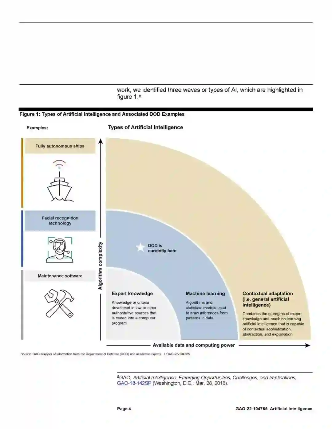 美国国防部(DOD)正在积极追求人工智能(AI)能力。人工智能指的是旨在复制一系列人类功能,并不断在分配的任务上做得更好的计算机系统。GAO之前确定了三种AI类型,如下图所示。