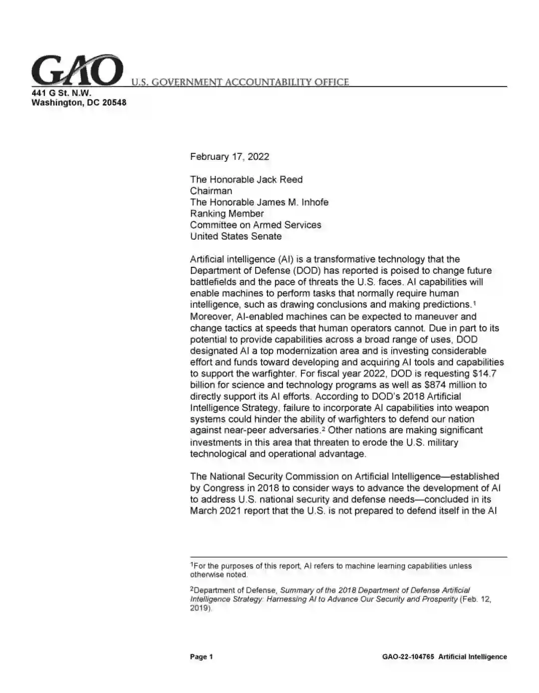 美国国防部(DOD)报告称,人工智能(AI)是一项革命性的技术,有望改变未来的战场和美国面临的威胁的速度。人工智能能力将使机器能够执行通常需要人类智能的任务,如得出结论和做出预测此外,人工智能机器可以以人类操作员无法企及的速度操纵和改变战术。由于AI具有广泛用途的潜力,国防部将其指定为顶级现代化领域,并投入大量精力和资金开发和获取AI工具和能力,以支持作战人员。在2022财年,国防部为科学和技术项目申请了147亿美元,以及8.74亿美元用于直接支持其人工智能努力。根据国防部2018年的人工智能战略,未能将人工智能能力纳入武器系统可能会阻碍战士保护我们的国家抵御近同行对手的能力其他国家正在这一领域进行大量投资,这可能会削弱美国的军事技术和作战优势。