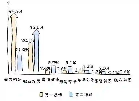 看来大家的压力主要源于当下的学业科研情况,以及对个人未来发展(就业前途)的考量。