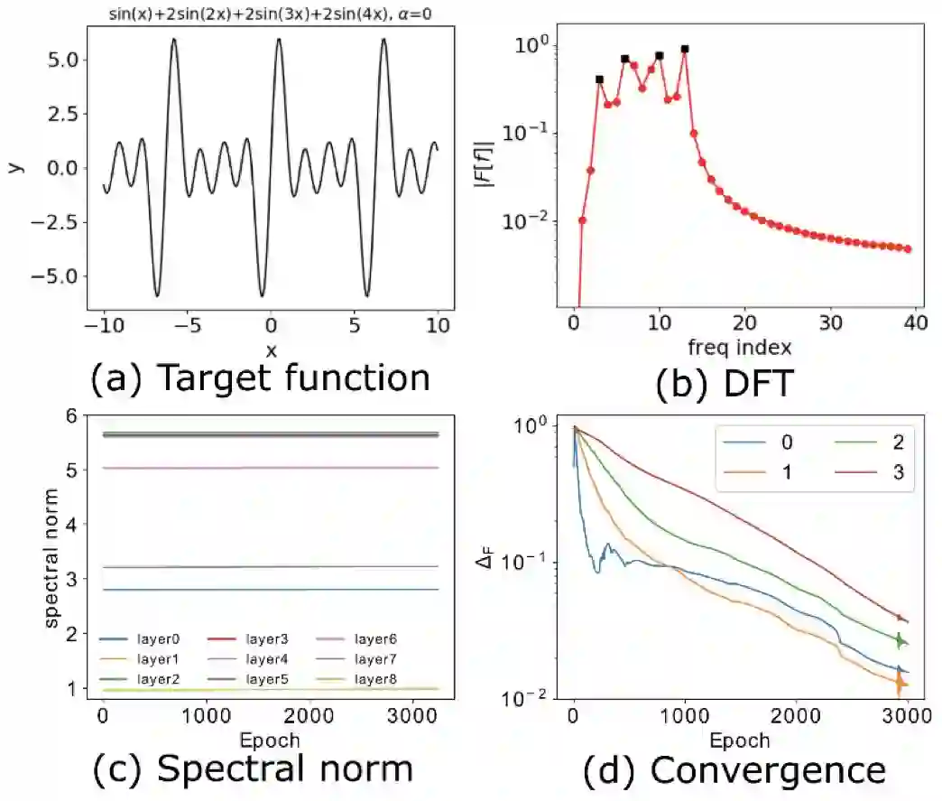 但如文献 [3] 的一个例子所示(下图,图 3a 为目标函数,图 3b 为其离散傅里叶变换),对于层数和神经元数目足够多的 DNN,权重的谱范数(图 3c)基本不变。但如图 3d 所示的频率成分的相对误差,四个重要的频率峰值(图 3b 的黑点)仍然是从低频开始收敛。对于这种情况,文献 [2] 对 DNN 的拟合函数的高频成分的上限估计在训练过程中基本不变,从而不能看出低频到高频学习的频率原则。
