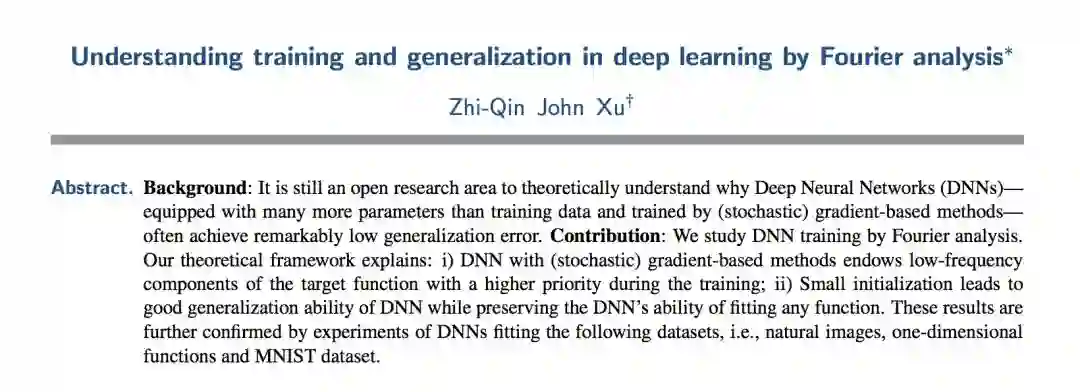 我们可以从拟合一维函数出发考虑这个问题。训练数据集是少数几个均匀采样数据点,如果用多项式去拟合,阶数很高的时候(大于数据点个数),拟合的结果通常是一个能够精确刻画训练数据但振荡厉害的函数。但如果用 DNN,无论多大规模,通常学习到的曲线都是相对平坦的。因为是一维函数,所以很容易想到,振荡和平坦可用傅里叶分析定量地刻画。于是就自然能猜想到,DNN 在学习的时候可能更加偏爱低频成分。