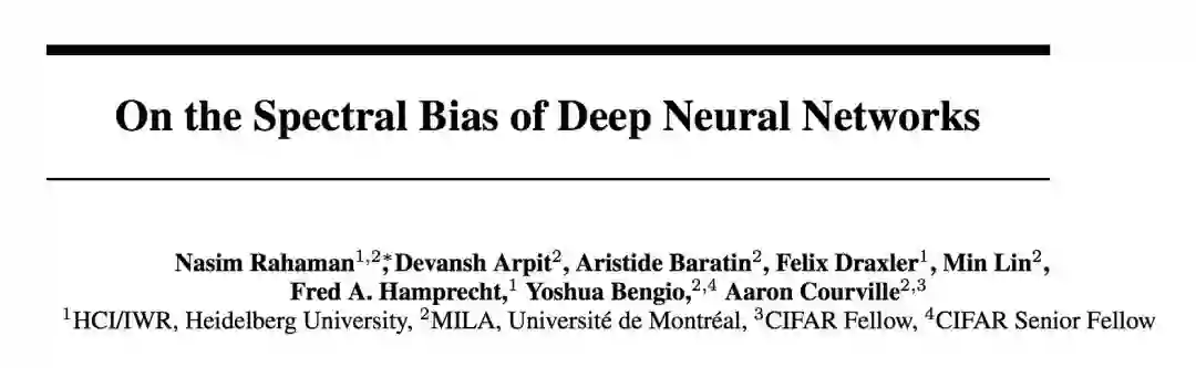 [2]. Nasim Rahaman, Devansh Arpit, Aristide Baratin, Felix Draxler, Min Lin, Fred A. Hamprecht, Yoshua Bengio, Aaron Courville. On the spectral bias of deep neural networks, arXiv preprint arXiv:1806.08734. (First submitted to arXiv Jun 22, 2018)