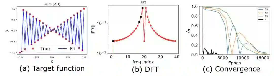 下面是一个一维函数的例子 [1](图 1a 中的黑点),对数据作离散傅里叶变换后如图 1b 所示,考虑图 1b 中的频率峰值(黑点)在训练中的相对误差,如图 1c,频率越高,收敛越慢(蓝色表示相对误差大,红色表示相对误差小)。频率原则可以粗糙地表述成:DNN 在拟合目标函数的过程中,有从低频到高频的先后顺序。(Frequency Principle or F-Principle in [1], or spectral bias in [2])